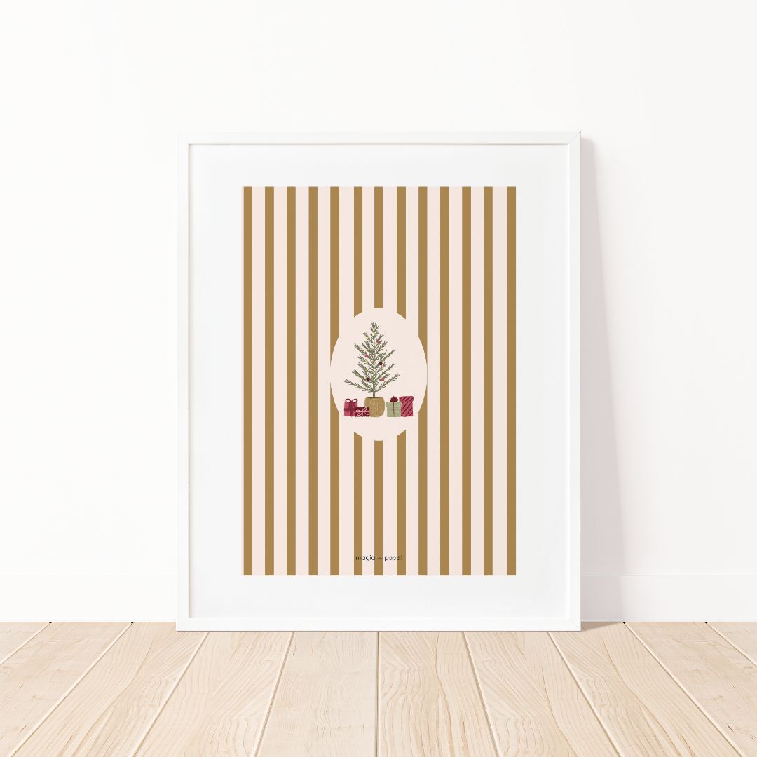Lámina navideña con ilustración de un árbol de Navidad, con fondo de rayas, en estilo cálido y acogedor. Disponible en tamaños A5, A4 y A3, perfecta para decorar cualquier espacio con espíritu navideño.