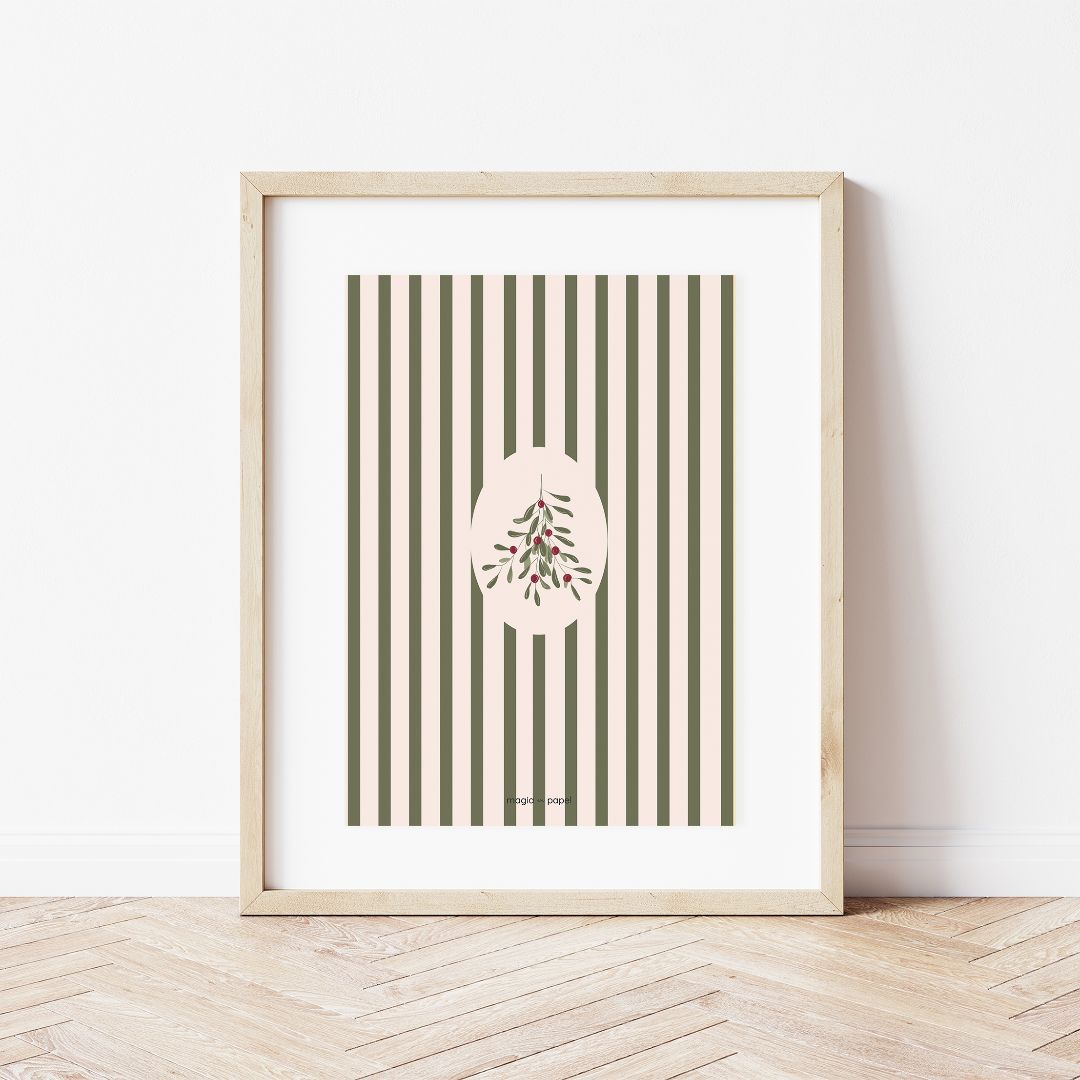 Lámina navideña con ilustración de un muérdago de Navidad, con fondo de rayas, en estilo cálido y acogedor. Disponible en tamaños A5, A4 y A3, perfecta para decorar cualquier espacio con espíritu navideño.